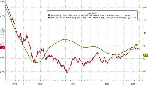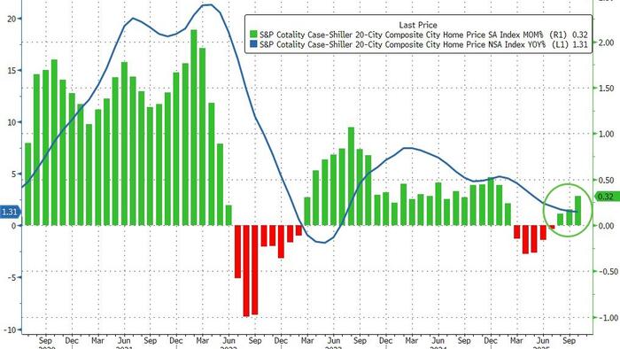 Home prices in America’s largest 20 cities surged 0.32% MoM in October (far higher than the +0.1% MoM move expected) but for context, this is the weakest annual home price growth since the March through July 2023 period, when the market was absorbing the initial shock of the Fed’s rapid rate hikes