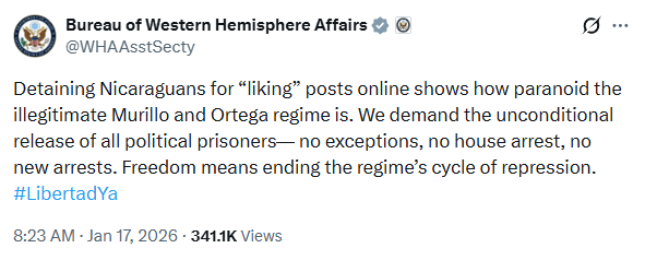On Friday, the State Department’s Bureau of Western Hemisphere Affairs posted to Twitter/X condemning Nicaragua’s government for—and I quote—”detaining Nicaraguans for liking posts online,” calling it evidence of “how paranoid the illegitimate Murillo and Ortega regime is.” The Bureau demanded “the unconditional release of all political prisoners” and declared that “freedom means ending the regime’s cycle of repression.”