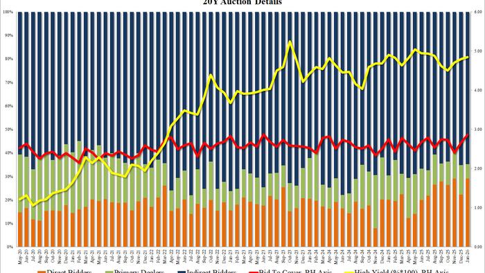 In a week when global yields have exploded higher following the historic rout in Japan’s bond market, many were nervous about the outcome of today’s 20Y Treasury auction. In retrospect, they had no reason to be worried: the auction closed with flying colors amid solid demand.