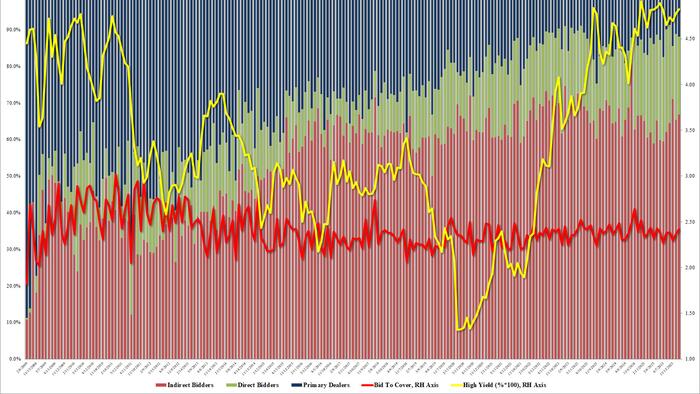 Bottom line: a very strong auction, which was also facilitated by today’s surprisingly cool CPI report, which swung the long-end from an intraday high of 4.20% to a low of 4.15%, and was last trading at 4.165%.