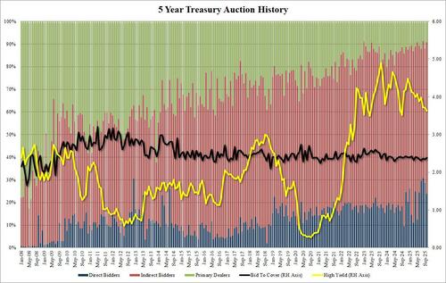 The internals were more impressive, with Indirects jumping from 59.42 last month to 66.84, the highest since May and above the 64.2% recent average: this sharp increase in foreign demand was also a mirror image to the slide in Indirects in today’s earlier 2Y auction. And with Directs awarded 23.9%, or down from 28.6% and the lowest since May (a far cry from the near record Directs in today’s 2Y auction, if above the recent average of 22.1%), Dealers were left with a modest 9.3% of the 5Y auction, below the recent average of 10.7%.