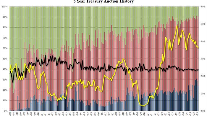 Pricing at a high yield of 3.625%, not only was this the lowest high yield since Sept 24, but also stopped through the 3.626% When Issued by 0.1bps, the first stop through for the 5Y tenor since May, in many ways a mirror image of what we said in today’s earlier auction.