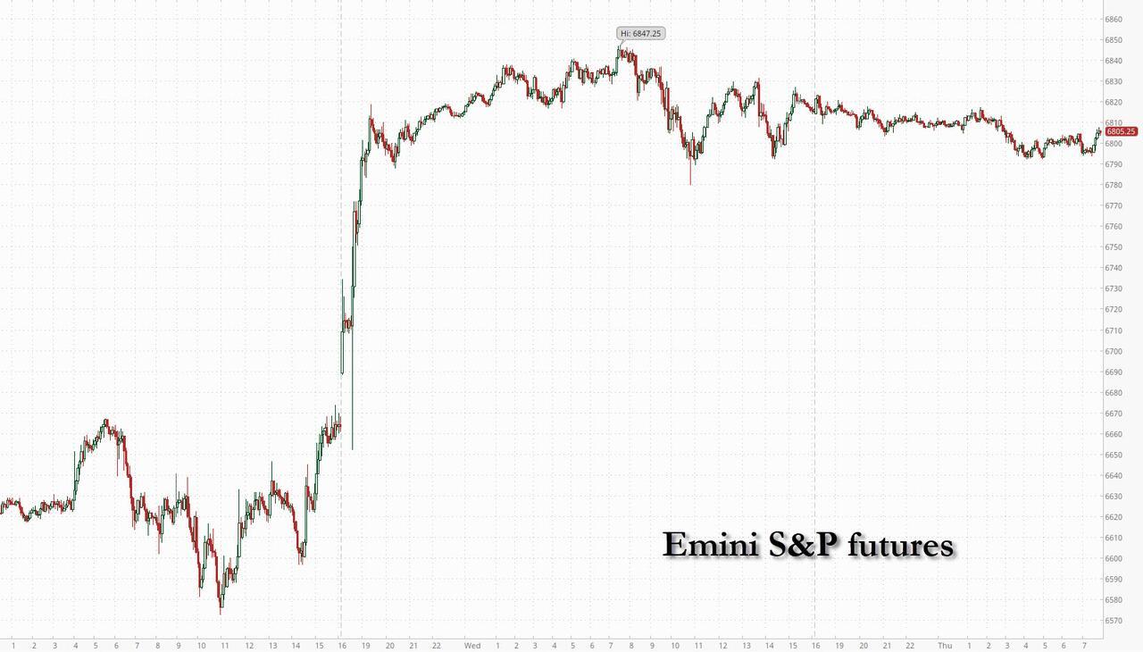 Stocks resumed their drop and oil erased about a third of its Wednesday drop as traders watched the fragile US-Iran ceasefire shatter by the hour, with both sides accusing the other of breaches while the Strait of Hormuz is still effectively closed and Israel intensified strikes on Lebanon. As of 8:00am ET, S&P futures fell 0.4% after Bloomberg strategists said a best-case scenario has already been priced in; Nasdaq futures dropped 0.3% with Mag7 stocks mostly lower. Europe’s Stoxx 600 index fell 0.7%. Emerging-market stocks slid almost 1%. The dollar ticked higher even as 10Y US YST yields dropped about 1bp; equivalent UK yields rose six basis points after tumbling almost 20 basis points on Wednesday. Brent crude jumped back to $98 a barrel on signs the Strait of Hormuz is still effectively closed. US economic data calendar includes February personal income/spending (with PCE price index), weekly jobless claims and third estimate of 4Q GDP (8:30am) and February wholesale trade sales and inventories (10am). Fed speaker slate is blank until April 14.