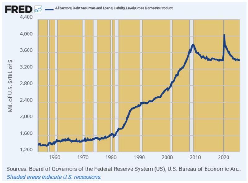 US Total Leverage Ratio: Debt-to-GDP, 1954 to 2025