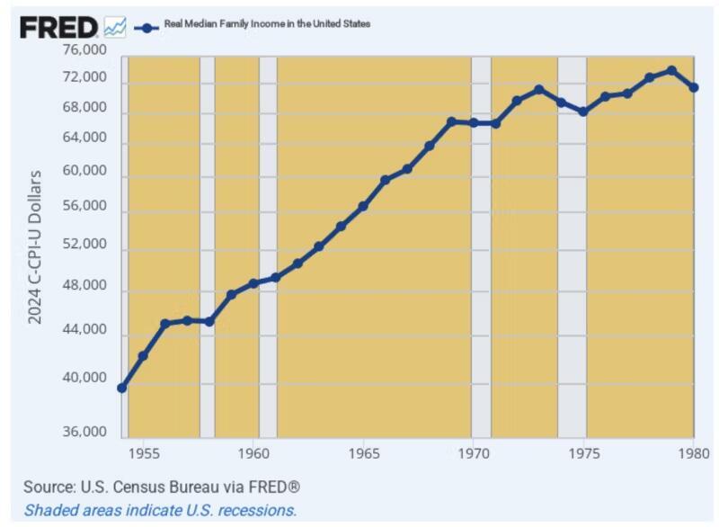 As it happened, the 1970s stagflation came on the heels of what had been an actual Golden Age by the standards of history between 1954 and 1969. During that period, real median family incomes rose from $39,700 to $66,870 or by a robust 3.53% per annum.