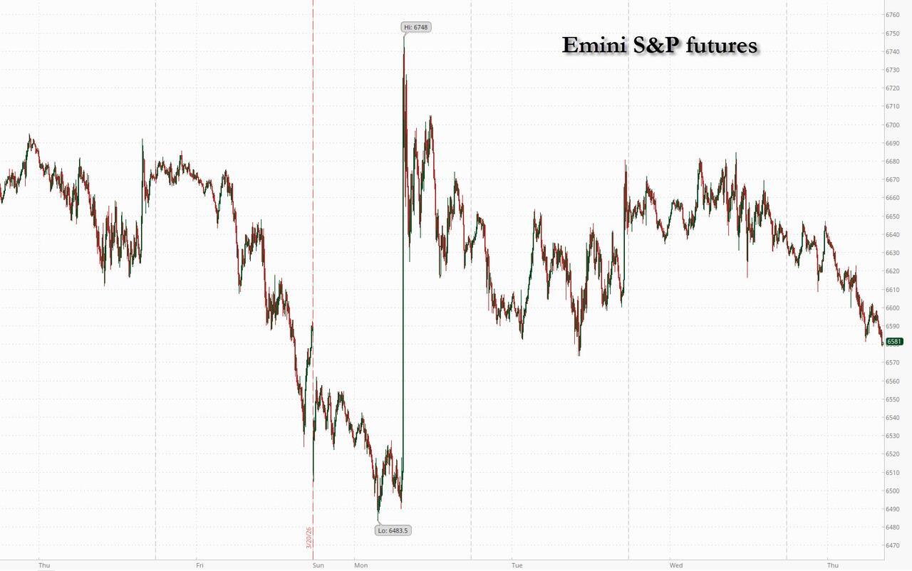 It’s Day 27 of the war: stocks and bonds fell globally as ceasefire optimism fades given mixed messages on progress toward ending the war in Iran and growing uncertainty over Iran’s willingness to engage in talks about a ceasefire in the Middle East sent oil prices higher. Futures gapped lower just after 5am ET, when Axios reported that the Pentagon is developing military options for a “final blow” in Iran that could include ground troops.  Trump urged Iran “to get serious” before it was too late but Tehran is steadfast saying no negotiations are occurring and both side rejecting each other’s deal demands as the fighting continues & more military assets arriving. As of 8:00am ET, S&P 500 futures dropped 0.9%, at session lows, with about 48 hours before a US delay in strikes on Iranian energy infrastructure expires. Nasdaq futures slumped more than 1%.In premarket trading, Mag7 names were down with all sectors lower ex-Energy. Brent resumed its advance, rising 3.8% to above $106 a barrel; Oil is on track for its biggest monthly jump in more than three decades, as the Trump administration examines potential consequences if prices spike to $200 a barrel. The move rekindled inflation fears and pushed yields higher as money markets priced in tighter monetary policy. Two-year Treasury yields rose four  basis points to 3.93% as the yield curve bear flattened with yields +4 – 6bp; the 10Y yield was back up to 4.39%, pushing the USD also higher. Gold slipped below $4,450 an ounce. Today’s macro data focus is on initial / continuing claims