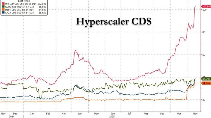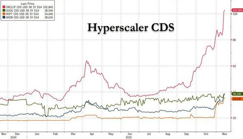 The development highlights a scramble to hedge against an explosion in the value of AI companies and their growing debt burdens, described in our article that “Oracle Is First AI Domino To Fall After Barclays Downgrades Its Debt To Sell.”