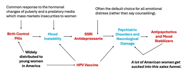 As you might guess, I am not a fan of this business model, and one of my goals here is to gradually go through why each of these malignant drugs can cause so many problems. Fortunately, we are at last seeing a massive cultural shift on this issue, highlighted by things like a recent interview (viewed 57 million times) where Tucker Carlson and Elon Musk discussed the birth control-antidepressant sales funnel: