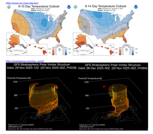 On the gas and PMI power front, Henry Hub sold off into the close yesterday but rallying again now; the EIA gas storage numbers showed the first of the winter withdrawals {DOENUSCH Index}. Weather fronts look to be keeping cold air across almost all of the east and central/south U.S. states for the next 14 days. I would expect that to be part of the reason we have seen a $20 move in peak PMI power since mid-October. Interesting note on “severe-weather.eu” about the winter effects of La Nina conditions, where cold Pacific ocean temperature anomalies are being observed. They are confirming the type of stratospheric warming event I mentioned last week, however speaking to my gas traders that breakdown doesn’t appear as severe as previously thought, as the vortex looks to only be disrupted until early December (Strat Observe). Under La Nina conditions, the winter effects can be severe. La Nina acts to redirect the jet stream south, with persistent high pressure over the Northern Atlantic and low pressure over Canada; this in turn brings cold air under the jet stream in western Canada and north west U.S. You can see in the Marquee email note the weather patterns and vortex forecast visuals.