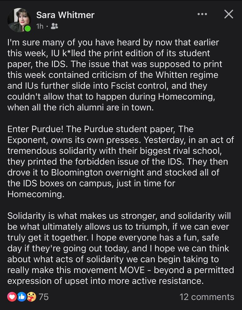 Indiana University officials are trying to pretend that their silencing of the student paper’s print edition is simply an act of modernization; but local student journalists and editors at both universities say they’ve faced relentless pressure to eliminate any criticism of the Trump administration or the cowards that are making Trumpism so effective at destroying civil rights, free speech, and the rule of law.