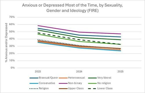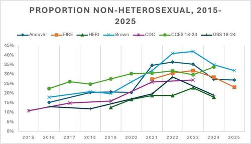 Non-conforming sexual identity (queer, questioning, etc) is also in sharp decline. Gay and lesbian are stable while heterosexuality has rebounded by around 10 points since 2023.