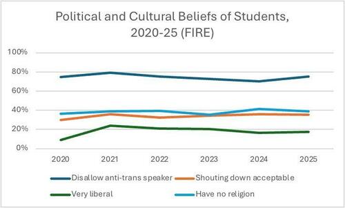 - Among U.S. university students, the transgender share fell from ~7% in 2023 to under 4% in 2025. Non-heterosexual identification dropped by about 10 points in the same period.