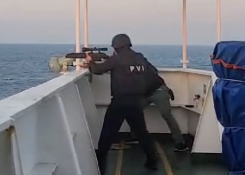 Shipping journal Lloyd’s List posted exclusive footage showing security personnel on the ship firing long rifles at the small boats.