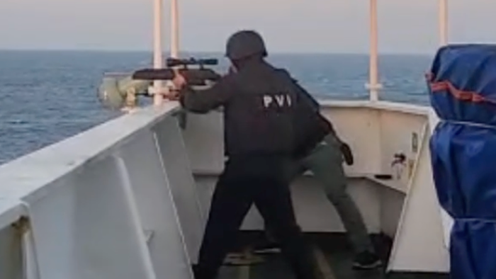 Shipping journal Lloyd’s List posted exclusive footage showing security personnel on the ship firing long rifles at the small boats.