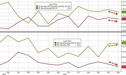 Following the disappointment on the Manufacturing PMI side (both S&P Global and ISM seeing their surveys decline in November), US Services surveys were more mixed in the face of ‘strong’ hard data (that has been largely absent due to the shutdown).