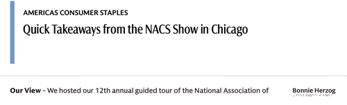 Goldman Sachs analysts hosted their 12th annual guided tour of the National Association of Convenience Stores (NACS) Show in Chicago. Analysts met with executives from major beverage, food, and nicotine companies, including Coca-Cola (KO), PepsiCo (PEP), Constellation Brands (STZ), Boston Beer (SAM), AB InBev (ABI), Monster (MNST), Celsius (CELH), and Hershey (HSY), among others, providing clients with an unparalleled snapshot of current trends across the convenience retail channel.