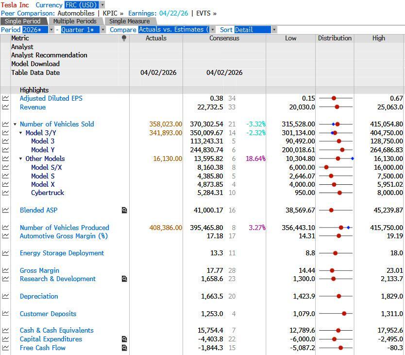 The company has been the laggard among mega-cap peers despite still-lofty expectations. Consensus points to 1Q revenue of about $22.7 billion, with adjusted EPS around 38 cents and roughly 25 cents on a reported basis, even as deliveries of about 358,000 vehicles missed forecasts and flagged softer core auto demand. Analysts still expect a sharp rebound, with roughly 30% profit growth and a 15% increase in revenue.