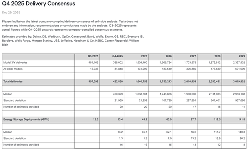 Tesla has compiled vehicle delivery forecasts from a broad group of Wall Street firms, including Daiwa, DB, Wedbush, Canaccord, Baird, Wolfe, Exane, GS, RBC, Evercore ISI, Barclays, Wells Fargo, Morgan Stanley, UBS, Jefferies, Needham, HSBC, Cantor Fitzgerald, and William Blair. The overall sell-side analyst consensus implies Q4 deliveries of roughly 422,850 vehicles, representing a 15% year-over-year decline and a 10% drop from the Bloomberg-compiled average of 445,061 vehicles.