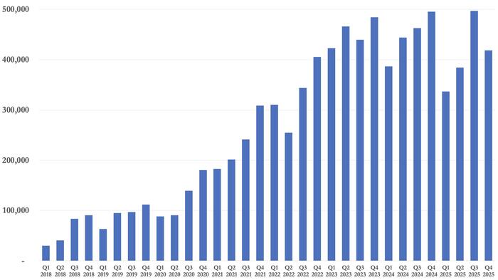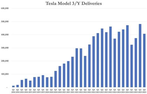 Tesla’s fourth-quarter breakdown showed 406,585 Model 3 and Model Y vehicles delivered, along with 11,642 deliveries from its other models, for a total of 418,227.