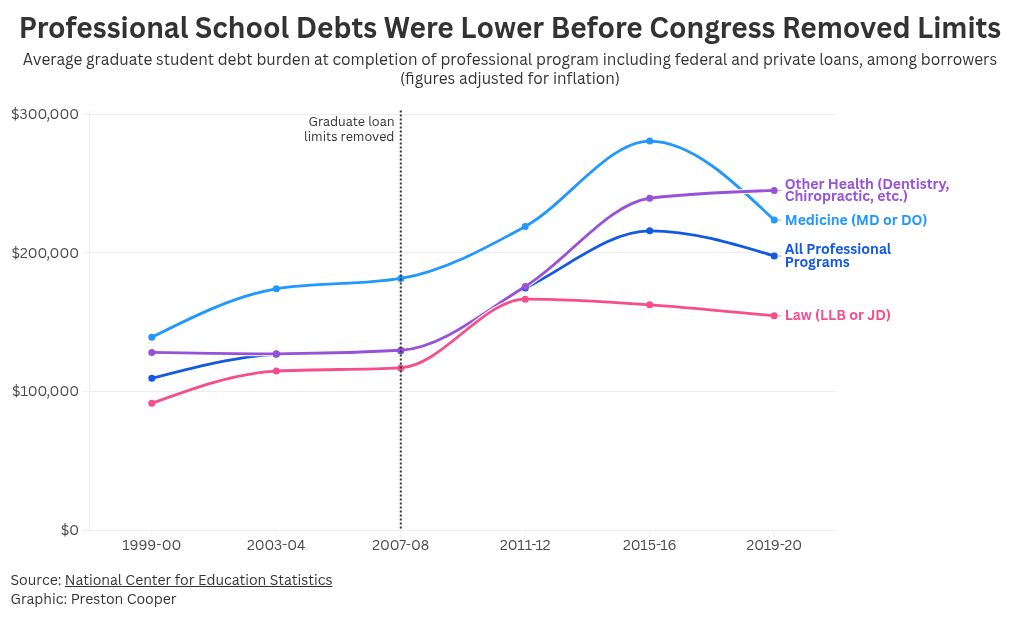Indeed, law schools were able to make federal student loan limits work in the not-so-distant past. In 2020, the average new law school graduate accumulated $155,000 in student debt. But in 2004, just before Congress enacted the Grad PLUS loan program that eliminated caps on borrowing, average law school debt stood at just $115,000 (adjusted for inflation and including both federal and private loans).