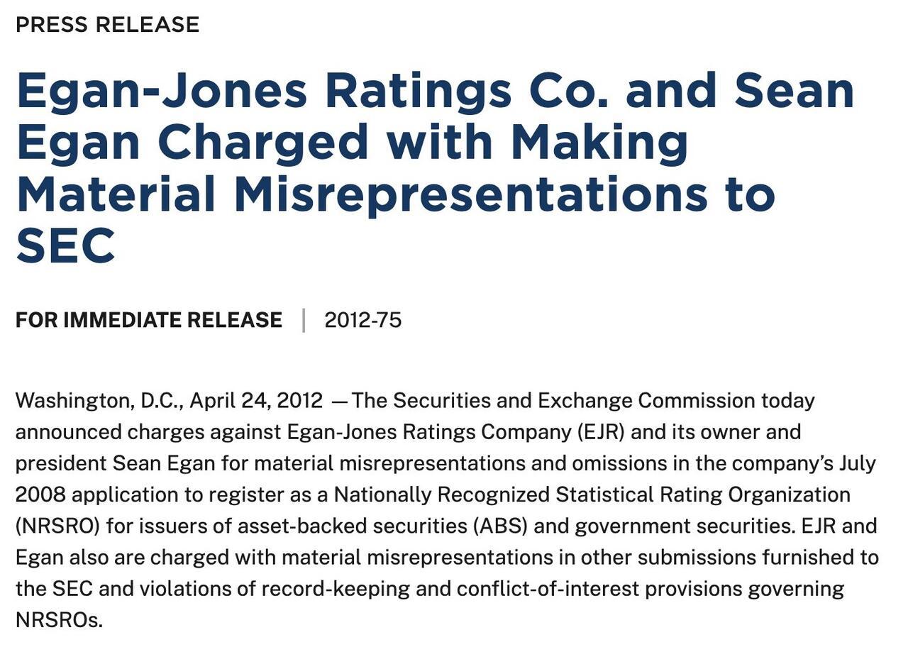 Egan-Jones is an easy place to start. For years, it has faced recurring regulatory scrutiny, primarily from the U.S. SEC, over conflicts of interest, disclosure practices, and internal controls tied to its business model. The most significant action came in 2012, when the SEC charged the firm with misrepresenting its expertise in rating asset-backed securities, resulting in fines and a temporary suspension from rating certain structured products. Ongoing concerns have centered on compliance systems, documentation, and transparency, highlighting tensions between its independent approach and NRSRO regulatory standards.