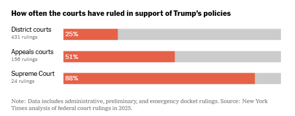 The Times analyzed every judicial ruling on Mr. Trump’s second-term agenda, from Jan. 20 to Dec. 31 of last year, or more than 500 orders issued across 900 cases. About half of rulings at the appellate level were in Mr. Trump’s favor — better than his performance with the district courts, though worse than his record at the Supreme Court, where the rulings on his agenda have almost all been on a preliminary basis in response to emergency applications.