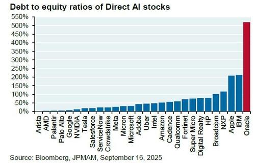 As JPMorgan’s Cembalest noted, Oracle’s debt to equity ratio is already 500% compared to 50% for Amazon, 30% for Microsoft and even less at Meta and Google.