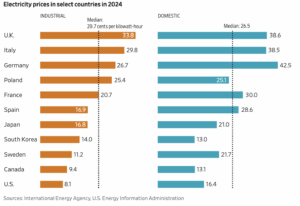 In the United States, President Biden made climate a major part of his policy goals, moving the country in the direction of Europe’s policies. As a result, electricity prices are increasing. Under Biden’s term, residential electricity prices increased 25%, and they have continued to increase this year by 10.5% through August. Industrial electricity prices have also increased by 6.7% from September 2024 to September 2025. The Trump administration is working on securing reliable energy that does not require the redundancy that wind and solar power need by keeping existing coal and nuclear plants on line and promoting more gas-fired generation. But many blue states, such as California and New York, have mandates for renewable power. Some also have “cap and tax” policies that add to the cost of electricity, similar to what is being experienced in Europe. Those states bring the national average electricity price higher. Artificial intelligence data centers and rising electricity demand due to Biden administration policies are also helping to increase prices as more capacity is needed to meet rising demand.