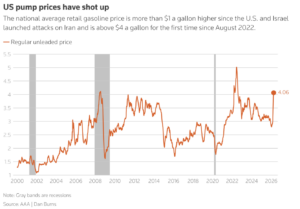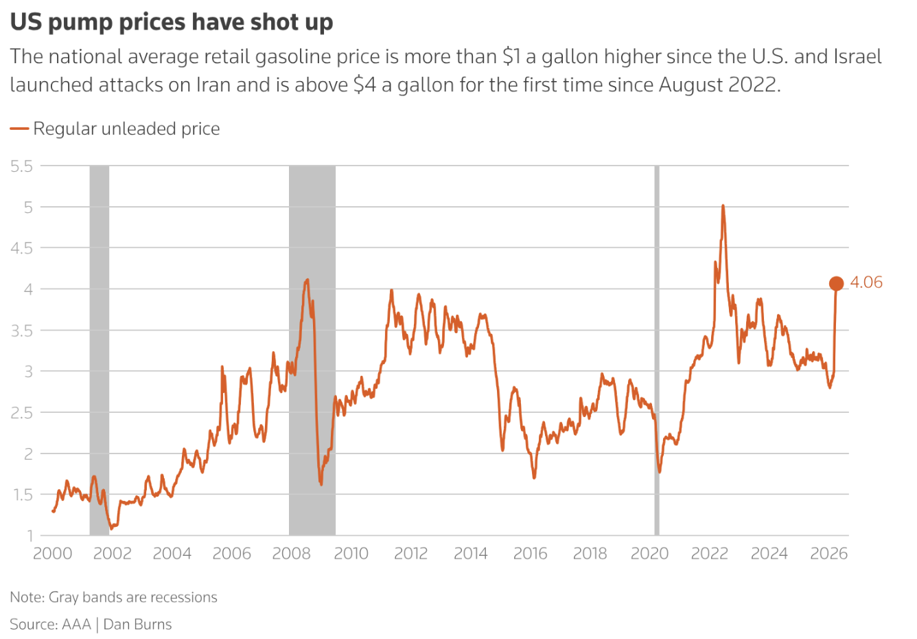 On March 17, the national average for regular gasoline was $3.79 per gallon, up from $3.54 the previous week and $2.92 a month prior. Prices are also higher than a year ago, when they were at $3.08 a gallon. According to AAA, they inched higher on March 18 to $3.84, up $0.85 from February 28 and the start of hostilities.