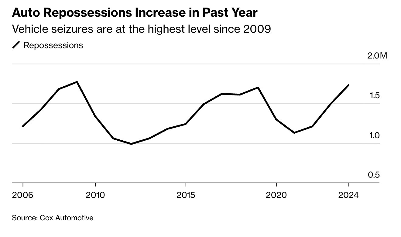 Bloomberg recently noted that more than 1.7 million cars were repossessed in 2024, the most since the post-crisis period. That’s more than a 40% jump from 2022, driven by the end of pandemic forbearance, persistent inflation, and sharply higher interest rates. A typical monthly payment now sits in the mid-$700s (this is almost my mortgage payment on my studio apartment in Philadelphia), and many subprime borrowers are paying rates above 10%. What used to be a manageable necessity has become a financial wedge.