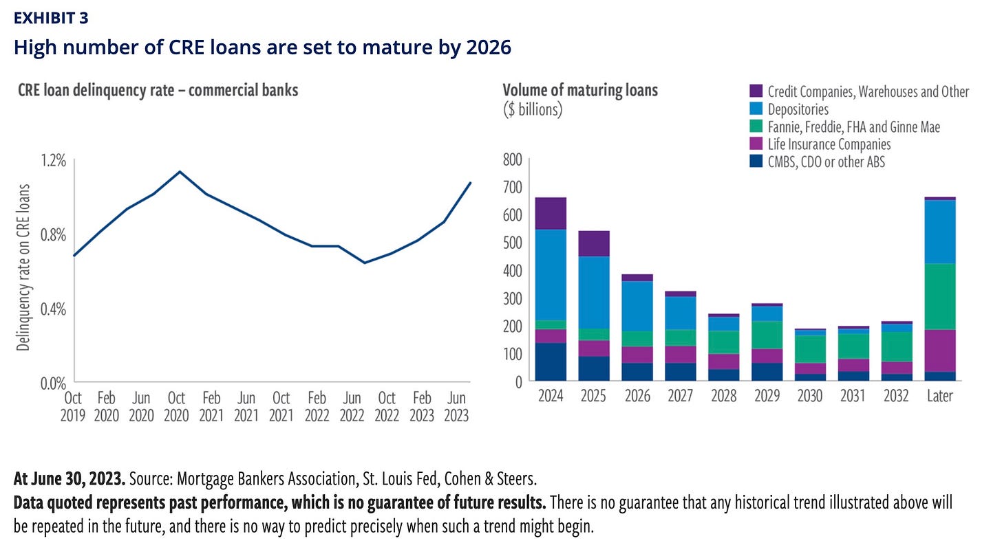 With valuations under pressure and a wave of loan maturities approaching by 2026, according to Cohen & Steers, lenders will likely face rising delinquencies and the need to boost reserves—especially where office loans or recently underwritten, higher-leverage deals are concentrated.