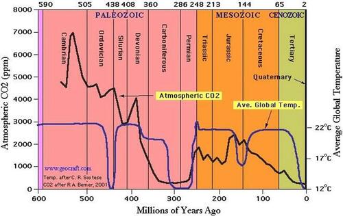 Let us consider some of these observations starting with the long term record over 600 million years. The graph below shows wide temperature-CO2 divergence.