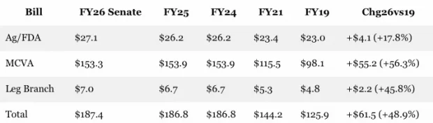 What is especially galling is that the alleged anti-spending GOP leadership did not hesitate to increase funding for Congressional staff and other Capitol Hill spending and perks to $7.0 billion in the Legislative Branch bill for FY 2026, representing a 45.8% increase from FY 2019. Similarly, the MCVA bill at $153. 3 billion is up by a staggering $55 billion or +56% from FY 2019 levels due to huge increases in funding for VA health care and special programs for Agent Orange and other toxic exposures.