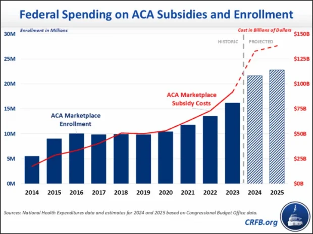 In fact, the cost of ACA subsidies has grown by nearly 8X during the last decade—-rising from $18 billion at its start to an estimated $138 billion in 2025. This spending explosion was due to growing enrollment, the inherent inflationary bias of ObamaCare and then sharply increased premium subsidy levels enacted on a temporary basis during the so-called pandemic “emergency”. Extending these enhanced pandemic era subsidies would ensure that the annual costs keep climbing skyward.
