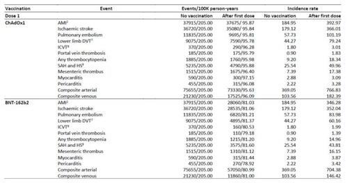 This seems to be a straightforward outcome, based on a most inclusive sample – the whole population of England. However, Table 2 shows incidence rates of cardiovascular events were substantially higher (nearly double for arterial events) after the first dose of the Pfizer and AstraZeneca vaccines, compared to no vaccination: