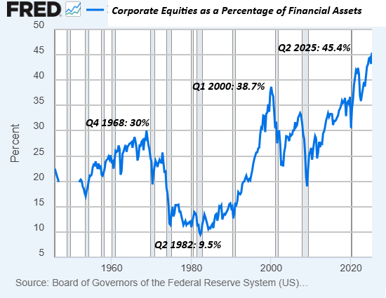 The trend that pops out of this long-term chart is that each new peak of household assets invested in stocks is higher than the previous peak. What will the nominal valuation of stock indices be when the percentage of household assets invested in stocks falls from 45% to 15%? What will the purchasing power of the money invested be (i.e. adjusted for real-world inflation) at that point?
