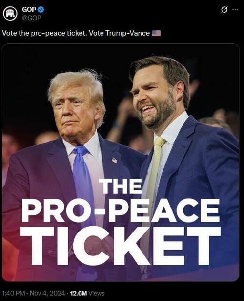 Indeed, the Trump administration overall has helped make it abundantly clear that US elections and public opinion are almost completely irrelevant to the foreign policy. Throughout his campaigns, Donald Trump repeatedly claimed to be the peace candidate, announcing in his speeches that he would end wars, rather than start them. In the days before the 2024 election, the GOP posted this image in social media, clearly presenting the Trump administration as “the pro-peace ticket”: