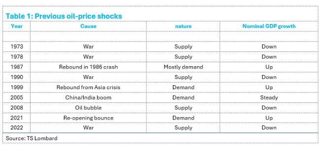 Historically, as he shares in the table below, nominal GDP almost always falls after a supply-driven oil shock.