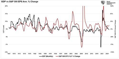 As noted above, earnings growth is fundamentally tied to economic growth. When demand exceeds supply, companies expand output, raise prices, and increase profits. As discussed recently, this is why, without inflation, there can not be economic growth, increasing wages, and an improving standard of living. In other words, for there to be stronger economic growth and rising prosperity, prices must increase over time. Such is why the Fed targets a 2% inflation rate, thereby supporting 2% economic growth and stable employment levels.