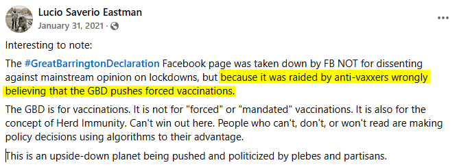 Both Bhattacharya and Kulldorff were mad that Facebook restricted access to the Great Barrington Declaration, a document they co-authored. But they fail to mention that the person running the Great Barrington Declaration website has publicly revealed that the reason Facebook blocked it was anti-vaxxers mass reporting the site — because they misread the declaration as supporting “forced vaccinations.” (There are more details at the link above).