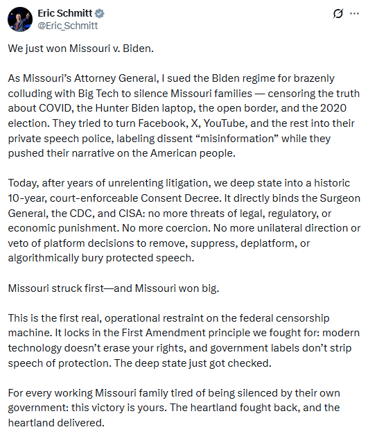 And so maybe it’s not surprising that just a week later, Schmitt was doing a victory lap over a “settlement” that his friends in the Trump administration very conveniently worked out with the remaining plaintiffs in the case. The framing, of course, was triumphant. From his post on social media: