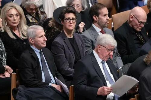 Joe Biden was there, perky as all get-out for somebody with stage-four prostate cancer, shaking hands with Mike Pence, who pulled him over the finish line in 2021. John Brennan, coupster superbus was there. Ditto John Bolton (awaiting trial). Most cheekily of all, Dr. Fauci, the father of Covid-19 and its little helper, the Covid vaxx, was seated next to MSNBC’s loss-leader, Rachel Maddow, who famously declared in 2021, “The virus stops with every vaccinated person!” (Not.)