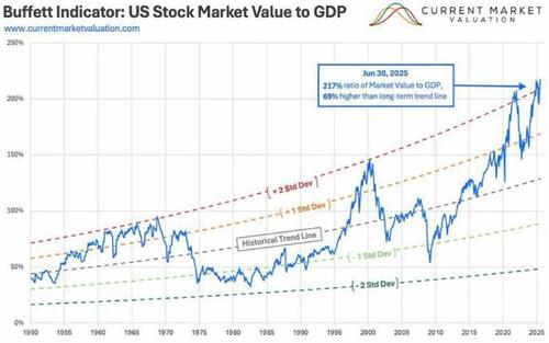 Consider the valuation extremes. The S&P 500 trades at 26 times trailing earnings, and the CAPE ratio hovers near 40x, levels seen only in the height of historic bubbles. The total stock market’s capitalization now exceeds 217% of U.S. GDP, a ratio Warren Buffett once identified as a warning flag. In the MarketWatch narrative: “The market, by this measure, is near the all-time peak reached during the epic bubble around the turn of the millennium.” Those numbers don’t lie.