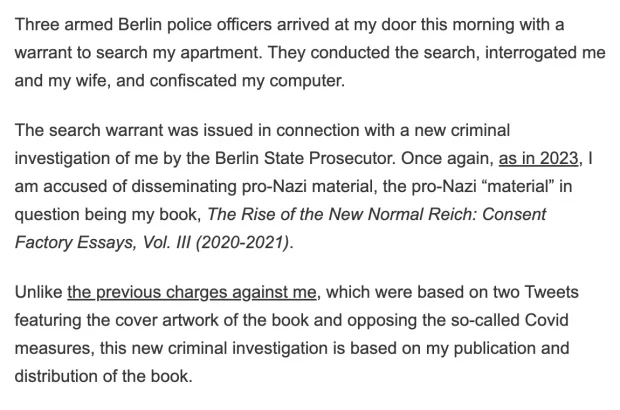What is happening to our American friend in Berlin is bad but it’s also pretty middle-of-the-road as far as German speech harassment goes. Lots of Germans have been punished much more heavily for doing much less, and I’ve carefully catalogued almost every single case that has made it into the press over the years.1 As far as I know, I’m the only person doing this in English at all. Most speech police victims don’t get any write-ups in the Atlantic. Matt Taibbi doesn’t give them interviews and Die Zeit could care less about them.
