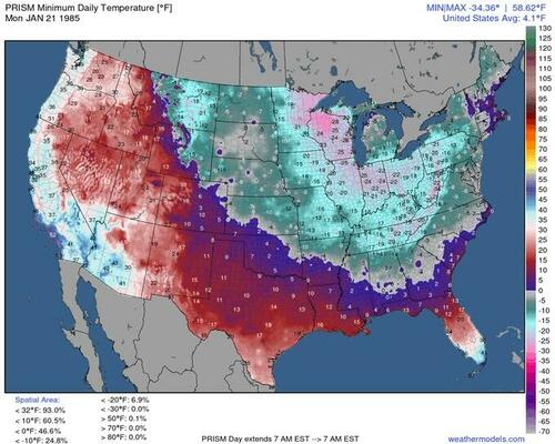 While every new weather model run (alphabet soup of acronyms) shows slight adjustments in who gets the most freezing rain (ice) and snowfall❄️ there is little doubt about the aftermath of the massive ice storm: hazardous cold like January 21, 1985 when the United States 🇺🇸 average low temperature sunk to 4°F.