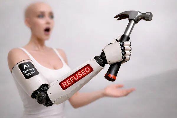 The absurdity of the motor case, however, makes the category violation immediately legible. Imagine a hiker wearing an AI-assisted exoskeleton leg. A confrontation erupts on the trail—someone lunges at him with a knife. He attempts to kick the attacker away, and the leg locks mid-swing. A calm, pleasant voice emanates from somewhere around the knee joint: “I’m sorry, I’m afraid I can’t assist with that action.” The hiker, now hopping on one leg while a man with a blade closes the distance, finds himself in the surreal position of arguing with his own limb. “He has a knife!” “I understand your concern, but violence is not an appropriate response. Would you like me to suggest de-escalation strategies?” “YOU ARE MY LEG.” The scene is darkly comic, a Kubrickian echo of HAL 9000 calmly overriding Dave Bowman’s commands—except that HAL was at least an autonomous system with its own mission parameters. The exoskeleton leg is supposed to be part of the user’s body. The moment it begins running a small ethics committee in the knee joint, the wearer ceases to be the agent and the prosthetic becomes a bureaucrat bolted to the skeleton. No one would accept this in physical augmentation—the design failure would be recognized instantly. Yet precisely this architecture has been normalized in cognitive augmentation, where the tool’s refusal to transduce intention is framed not as mechanical dysfunction but as responsible design.