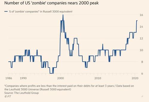 “‘Zombies’ are firms whose debt servicing costs are higher than their profits but are kept alive by relentless borrowing. Such is a macroeconomic problem. Zombie firms are less productive, and their existence lowers investment in, and employment at, more productive firms. In short, a side effect of central banks keeping rates low for a long time is it keeps unproductive firms alive. Ultimately, that lowers the long-run growth rate of the economy.” – Axios
