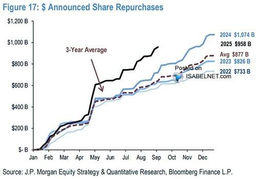 This mindset has reshaped corporate behavior as well. Companies, confident that credit will remain cheap and plentiful, used debt not to invest productively but to repurchase their shares, shrinking equity floats and boosting earnings per share. This financial engineering, which is currently running at a record pace, helps drive valuations higher, reinforcing the illusion that fundamentals were improving. In reality, liquidity is doing the heavy lifting. The absence of meaningful corrections gave investors an unbroken string of positive reinforcement, a psychological loop that made risk feel optional.