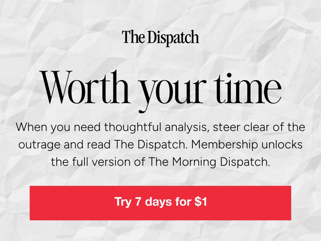 You’re reading The Morning Dispatch, our flagship daily newsletter explaining all the news you need to know today in fewer than 10 minutes. Today’s newsletter has been unlocked by our sponsor. To unlock the full version every day, become a Dispatch member today.