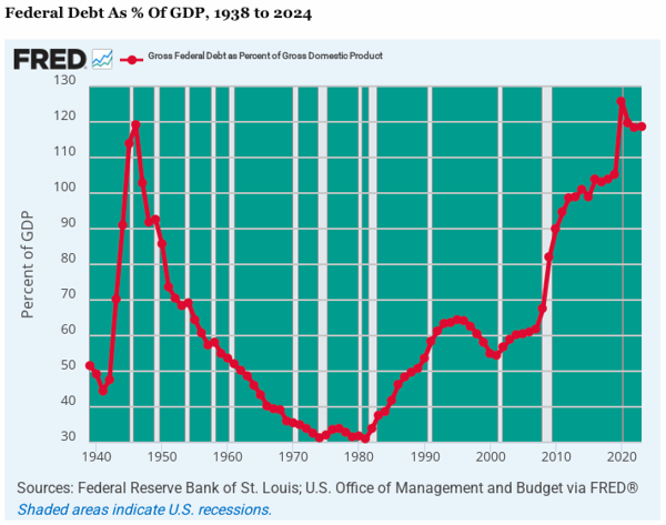 In fact, when the GOP-Dixiecrat coalition put an end to the New Deal in 1938, the public debt stood at 52% of GDP – before the exigencies of WWII sent the ratio soaring to a peak of 120% of GDP in 1946.